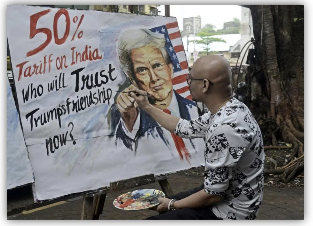 ||印度孟买,一位艺术家创作抗议特朗普对印加关税的作品。